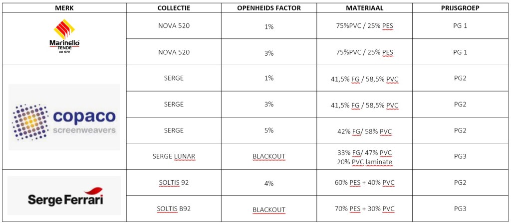 Onze zip screens zijn gemaakt met gebruik van beste glasvezel stoffen die komen uit bekende fabrieken zoals: Marinello, Copaco en Serge Ferrari in verschillende doorzichtbaarheid varianten.